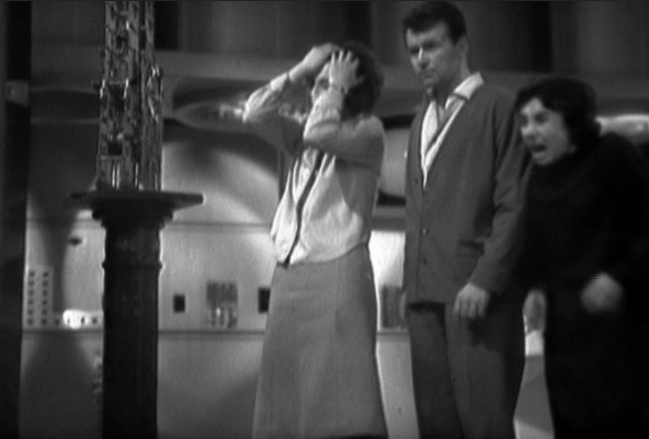 It’s strange though: it looks stagier than any other Doctor Who episode I can think of. The script asks a lot of the actors, and they respond in different ways. William Russell plays Ian like a simpleton, only half comprehending what’s going on around him – before suddenly regaining his wits halfway through the episode to berate the Doctor. Carole Ann Ford goes manic, hurling herself to the floor, wearing a crazy hairstyle, messing up the sofa with scissors and being generally moody – it’s the most normal teenage behaviour we’ve ever seen from Susan. Predictably, Hill and Hartnell are more subtle: Hill has a slight edge to her, a catch in her voice which finally breaks when she loses her rag, magnificently, with the Doctor. The Doctor seems initially unaffected, but that’s only because he’s always been a paranoid control freak and whatever’s happening has only made this more pronounced.