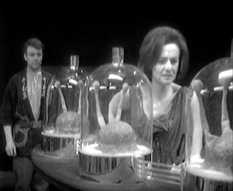 Nation’s script is particularly good at revealing the innermost desires and mindsets of the regulars. Barbara seems to just want a break, and to enjoy herself for a while – but, as in The Brink of Disaster, her instinct and intuition kick in and she perceives the truth of Morphoton. Ian is initially suspicious – the logical pragmatist, he expects there to be a price to pay for all the sumptuous riches. Of course, he’s right – but, lacking Barbara’s intuition, he doesn’t see what’s really going on, and ultimately falls victim to the Brains. The Doctor wants a laboratory to repair the TARDIS. Susan just wants fancy clothes. There’s also a growing hint of something more between Ian and Barbara – when she escapes from the dungeon, and sees Ian, Barbara runs up and kisses him on the cheek. This makes Ian turning on her all the more disturbing – certainly far more shocking than anything in The Edge of Destruction. The moment when he starts to strangle her is genuinely horrifying.