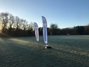 Having run through the gate, you bear left again, and follow the perimeter of the northern part of the park, running roughly parallel to the railway line. This is all on grass, and is quite flat until you turn left to cross a tarmac path onto another short section on grass. At the far end, as directed by marshals (and with the course well marked with cones), you then hairpin right and run about 300m along the top of the park on a tarmac path. This can get a bit icy in cold weather, but is very flat.