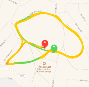 runners bear right onto a downhill section also on tarmac for about 50m, running alongside Montague Avenue. At the junction of Montague Avenue and Hilly Fields Crescent, runners bear left right again onto a dirt track. It’s worth bearing in mind that this section, and especially the turn, can be quite muddy and slippery, especially on the third lap when 500 pairs of feet have already churned up the ground a bit, so you might prefer to run on the grass alongside the track.