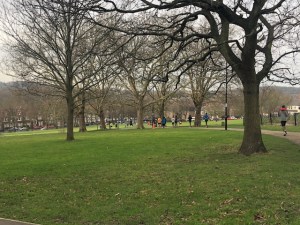Having passed the café and the tennis courts, runners then turn left, and run downhill on tarmac for a long stretch towards Adelaide Avenue. At the bottom of the hill, runners then circle a tree, and bear right up a steep hill, on grass for about 100m. This is easily the hardest section of this Parkrun (and one of the toughest bits of any London Parkrun). The grass can be slippery, you might have to dodge overhanging tree branches, and the uphill is a real test especially when you know it has to be tackled three times.