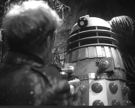 We then swap back to Kembel, and a scene that evokes the moment when Lowery begged Cory to kill him. However, though he’s hard bitten, Vyon doesn’t seem as coldly callous as Cory. He reluctantly leaves his injured friend to try to complete the mission. Kurt is then killed by a pursuing Dalek – in one of the short clips that survive from this episode the Dalek looms over him, impassively gunning him down. It’s only a moment, but it suggests that Douglas Camfield was finding interesting ways to film the Daleks. Based on what does survive, this was almost certainly awesome to watch.
