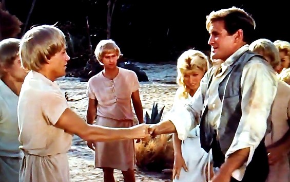 However, it’s Terry Nation’s original Dalek story that has the clearest overlap with this. Consider George, youthful and heroic, diving into a river to save Weena from drowning while her fellow Eloi barely notice her pathetic mewls of distress. The Eloi are beautiful people, within a narrow ethnic range, ideal specimens of humankind. But they are entirely passive, blissed out as they wander through the forests of future Earth and preyed upon by the Morlocks, just as the Thals, in theory the inheritors of Skaro, are helpless in the face of the Daleks’ superior gumption and determination. And just as in The Daleks, the young hero, Ian, can only defeat the monsters (and escape back to his own time) by inspiring the Thals to abandon their meekness and fight back, so here George must teach the Eloi to rebel.