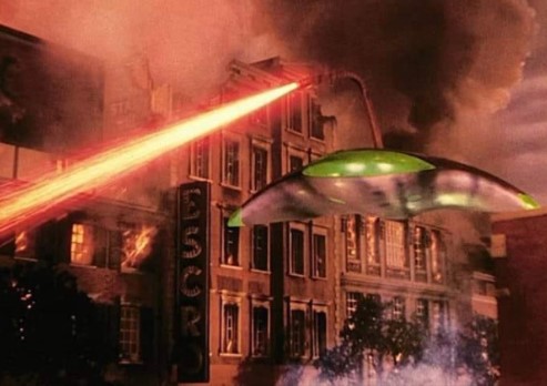 The War of the Worlds begins, like Wells’ novel, with the dying Martians, having rejected all other possibilities, turning their attention to the lebensraum of their neighbouring planet and plotting the extermination of humankind. The film transposes the action from Victorian England to post-war California, with the local community at first intrigued by the mysterious meteorite that arrives on the outskirts of town. It’s charming, in a hokey sort of way, but this quickly turns to horror when the meteorite opens up to disgorge a death ray that roasts some of the folksy townspeople, reducing them to Hiroshima-style outlines in the dirt. It’s first blood in an invasion that quickly extends across the entire planet, with cities levelled and the defenceless survivors retreating into the countryside or huddling in ruined cellars and subways to escape the invaders.