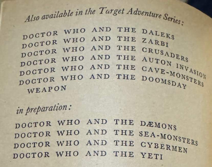 According to the 1974 paperback, books in preparation included “The Sea-Monsters” and “The Yeti” (ultimately released under their familiar titles The Sea Devils and The Abominable Snowmen).