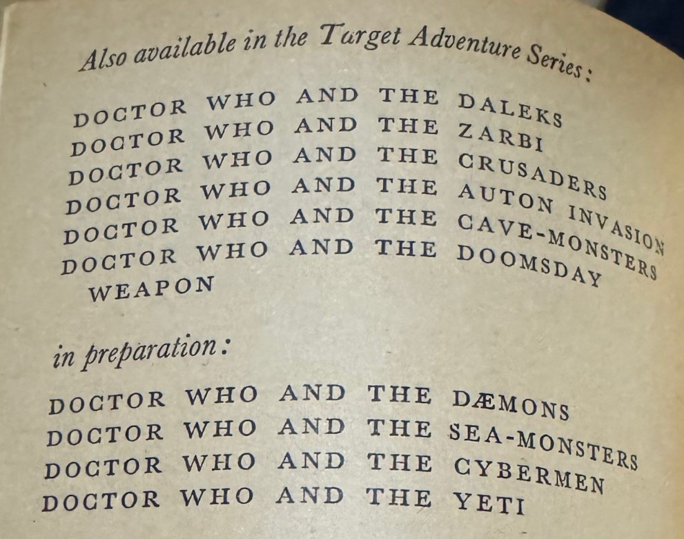 According to the 1974 paperback, books in preparation included “The Sea-Monsters” and “The Yeti” (ultimately released under their familiar titles The Sea Devils and The Abominable Snowmen).