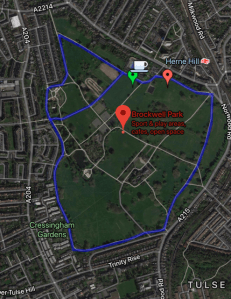 Hilly Fields is a small park in Lewisham, about 500m from Ladywell Station. As the name suggests, it’s an open space covering the hill next to Adelaide Avenue. From the top of the hill there are great views of London, plus a small and very pleasant café; tennis courts, and a bowling green. Many of the paths in the park look like they have recently been resurfaced – although only about half of the run is on these. The rest is on grass and dirt tracks round the edge of the park.